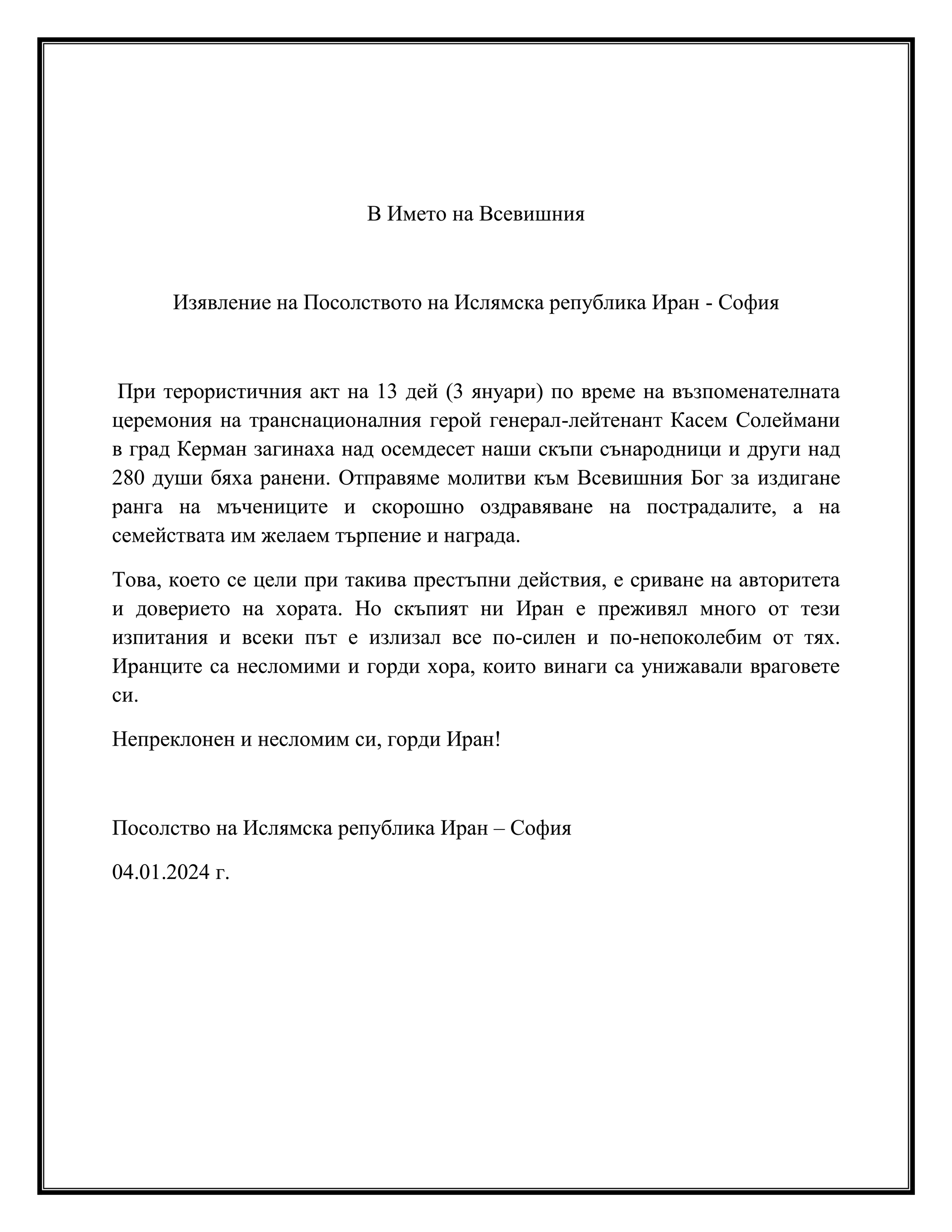 Изявление на Посолството на Ислямска република Иран - София