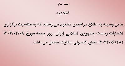 اطلاعیه تعطیلی بخش کنسولی سفارت روز جمعه 08/04/1403